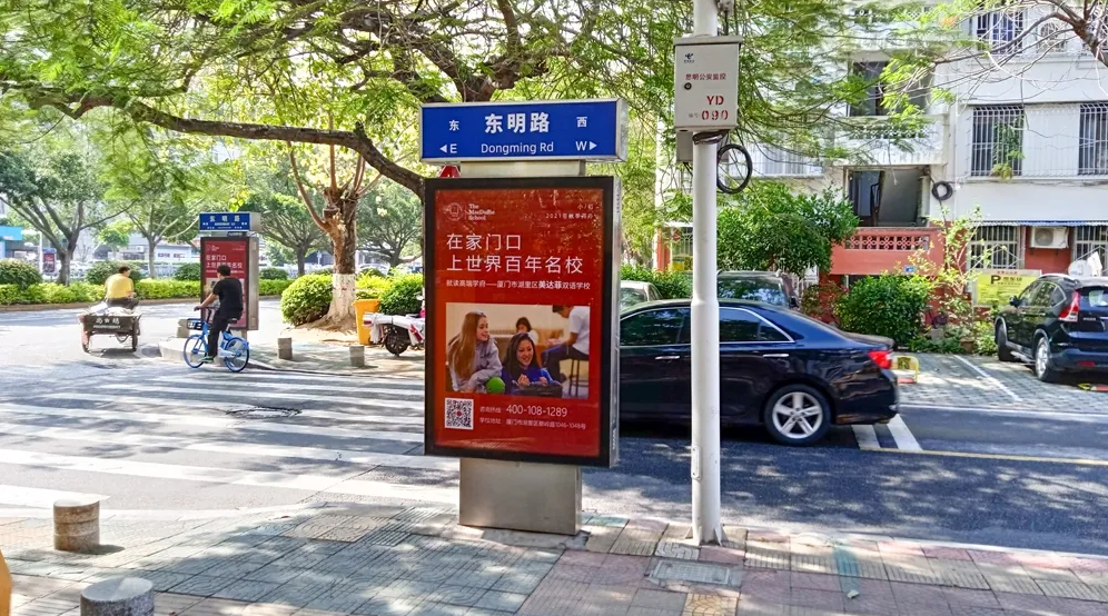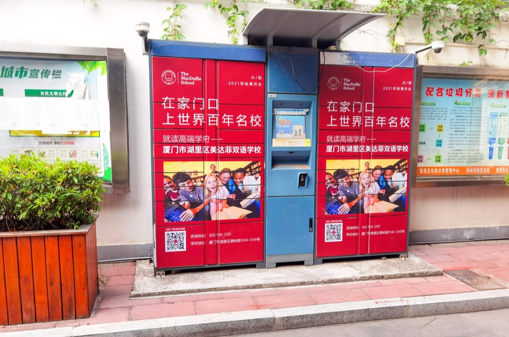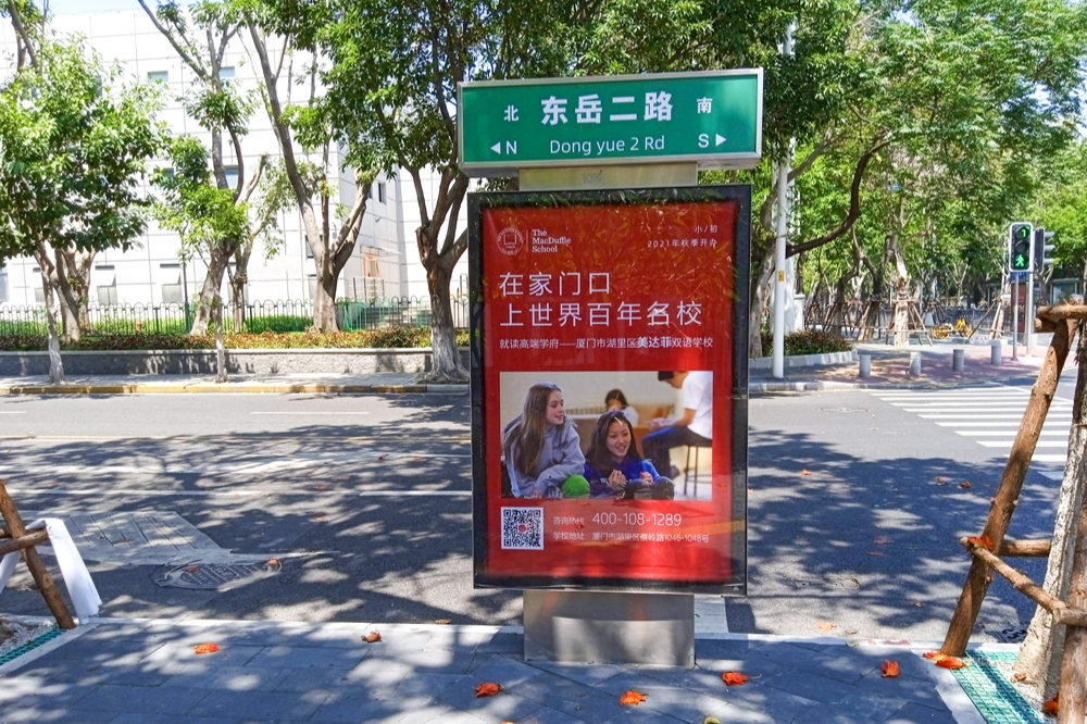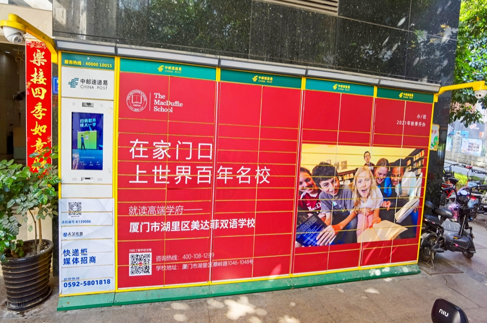 美達(dá)菲在廈門(mén)確定扎根后,重視線(xiàn)上線(xiàn)下的一系列宣傳告知,年后即開(kāi)始在廈門(mén)戶(hù)外多個(gè)渠道進(jìn)行大范圍的宣傳推廣,以“在家門(mén)口,上世界百年名校”為口號(hào),集中在五緣灣、觀音山、會(huì)展、萬(wàn)達(dá)廣場(chǎng)、蔡塘廣場(chǎng)等多個(gè)中高端商圈、商務(wù)圈,以及仙岳路、廈禾路、嘉禾路等多個(gè)主干道進(jìn)行城市路名牌的投放,同時(shí)在島內(nèi)多個(gè)高端住宅小區(qū)的快遞柜進(jìn)行大幅畫(huà)面展示。