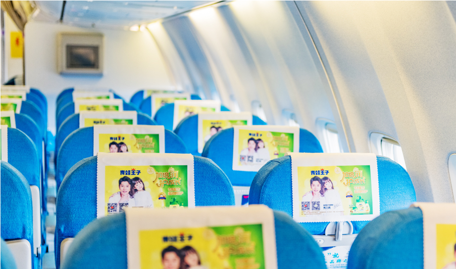 一進入機艙,每個座椅上醒目統(tǒng)一的頭片廣告,全艙集中呈現(xiàn),營造出一種沖擊力極強的視覺