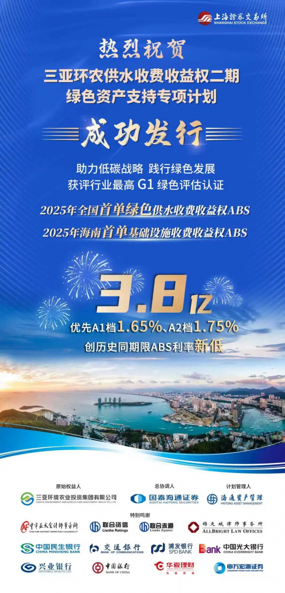 9月18日,三亞環(huán)農(nóng)集團(tuán)成功發(fā)行2025年全國首單綠色供水收費(fèi)收益權(quán)ABS與2025年海南首單基礎(chǔ)設(shè)施收費(fèi)權(quán)益權(quán)ABS,實(shí)現(xiàn)了業(yè)務(wù)領(lǐng)域的重要突破。近日,該項(xiàng)目憑借卓越的創(chuàng)新性與示范價(jià)值,一舉斬獲中國金融前沿論壇(CFAF)2025年度三大重磅提名: