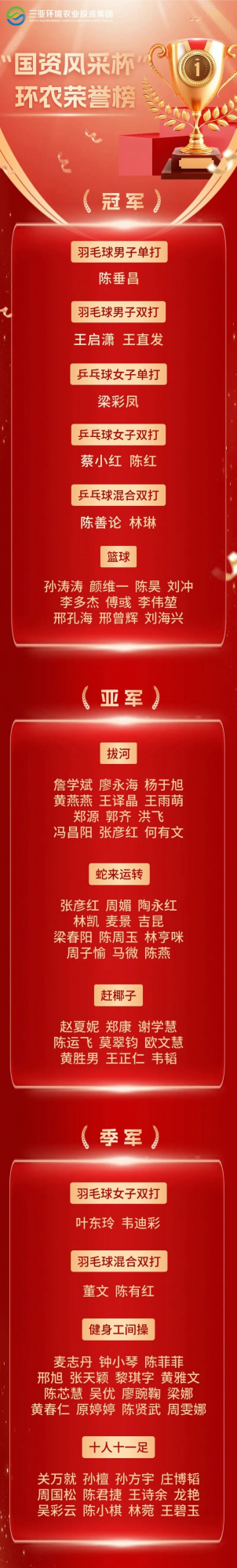 榮耀加身,未來(lái)可期。三亞環(huán)農(nóng)集團(tuán)將以此次賽事為契機(jī),把賽場(chǎng)上的拼搏精神轉(zhuǎn)化為推動(dòng)工作的強(qiáng)大動(dòng)力,凝心聚力、銳意進(jìn)取,在深耕海南自貿(mào)港相關(guān)產(chǎn)業(yè)、助力地方經(jīng)濟(jì)發(fā)展的道路上續(xù)寫新的篇章!